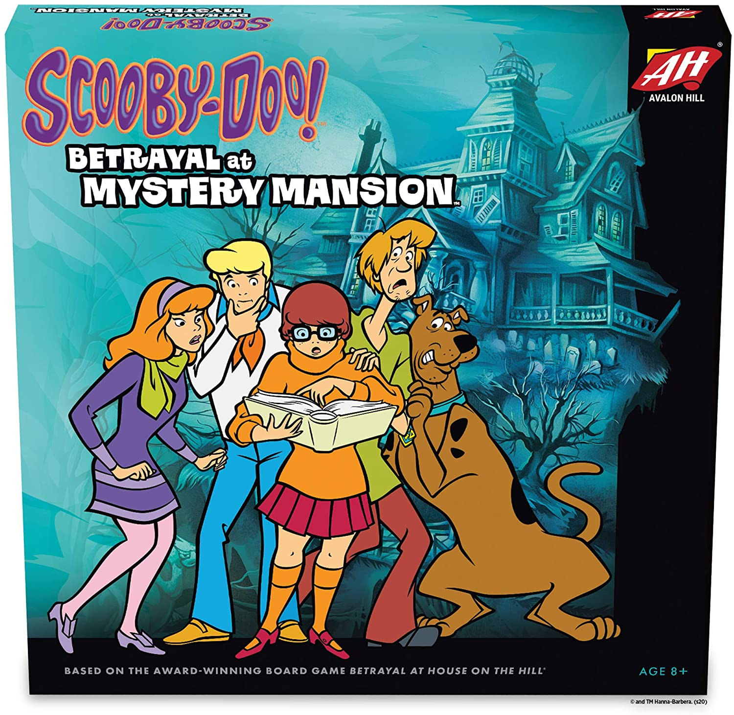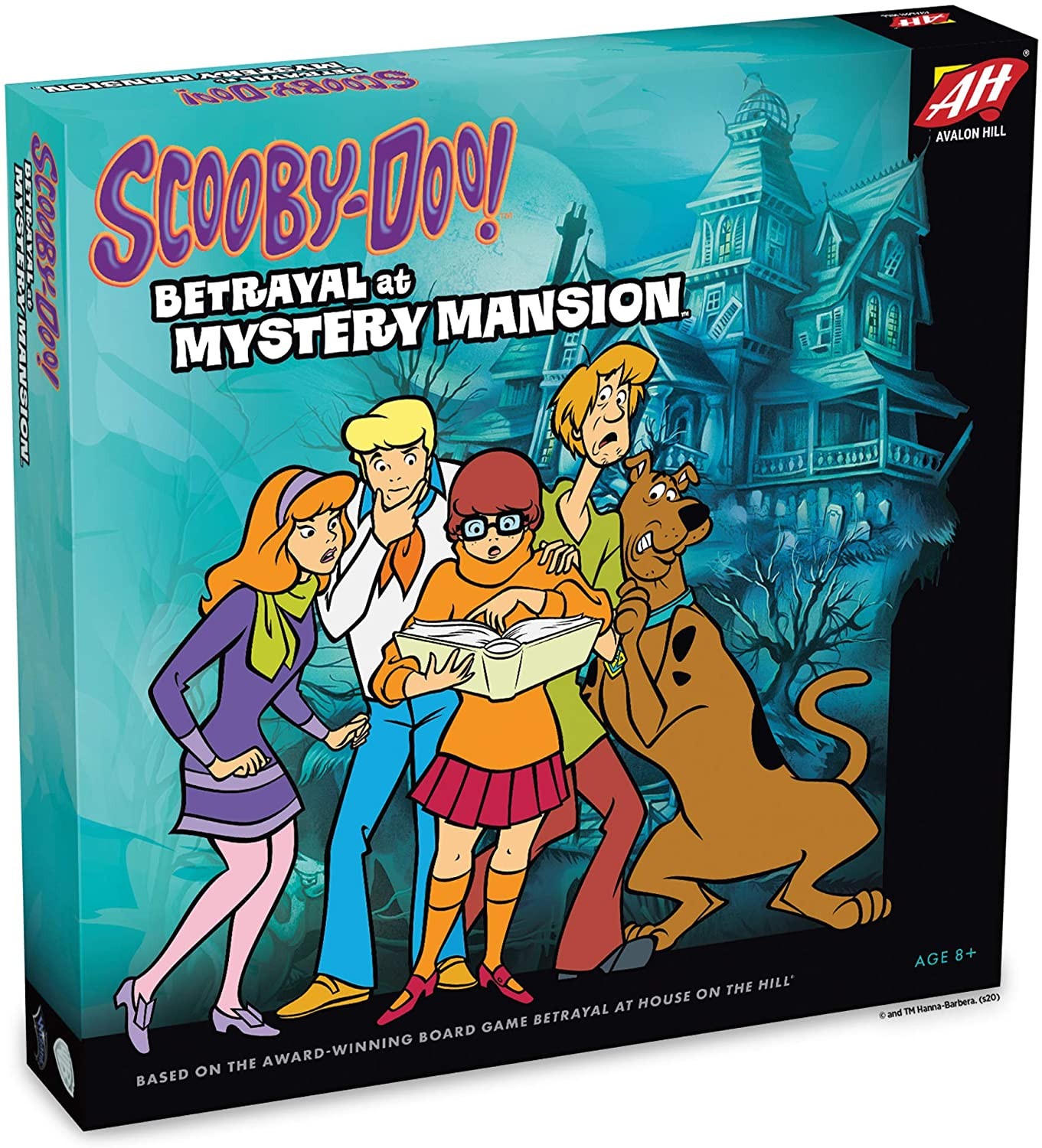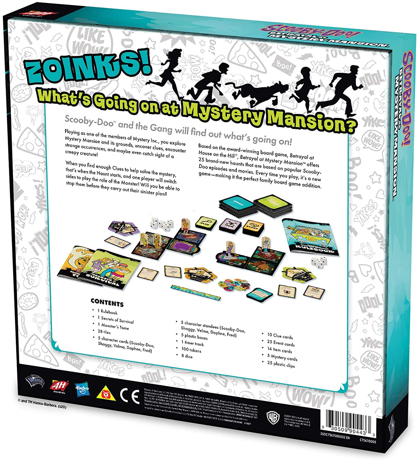 Based on the award-winning Betrayal at House on the Hill narrative board game, the Betrayal at Mystery Mansion game offers 25 haunts inspired by popular Scooby-Doo episodes and movies. Playing as one of the members of The Mystery Inc. Gang, players explore the mansion and its grounds, finding clues, encountering strange occurrences, and maybe even catching sight of a monster! Beware! At some point during the haunt, one player will switch sides to play the role of the Monster. Who will be able to stop them before they carry out their sinister plan? A different story is created every time it's played, making it the perfect family board game addition. This immersive, story-driven hidden traitor game is for 3-5 players, ages 8 and up. Includes 1 Secrets of Survival book and Monster's Tome book, 28 tiles (including 2 starting tiles), 5 character cards (Scooby-Doo, Shaggy, Velma, Daphne, Fred) 5 character standees (Scooby-Doo, Shaggy, Velma, Daphne, Fred), 10 Clue, 14 Item, 5 Mystery, and 25 Event cards, 5 plastic bases and 1 timer track, 100 tokens, 8 dice and 25 plastic clips. Hasbro Gaming and all related trademarks and logos are trademarks of Hasbro, Inc.