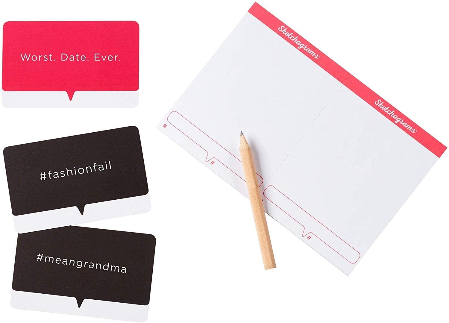 Create the perfect social media-inspired picture to accompany odd pairs of hilarious captions and hashtag! You're a caption-writing Pro. You're the master of memes. You can silence online Trolls with one pithy remark. Now see if you can create your own image to go alongside ridiculously funny captions and hashtag that you select at random. Pull one caption card and two hashtag cards, then you have forty-five seconds to draw a picture inspired by the combination. When the time is up, each player votes on which illustration they find the most outrageously funny and grant the artist A like token. You don't have to be a pro artist to steal the round -- in fact, the less practiced illustrators often end up with the funniest result! The player with the most like tokens after four rounds is the winner. Includes 76 caption cards, 148 hashtag cards, 36 like tokens, 6 paper pads and 6 pencils. Perfect for 3-D players, 14 years old and up.
