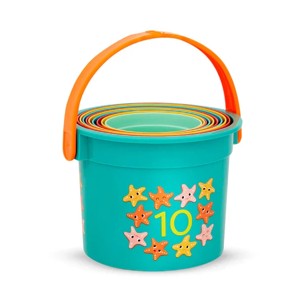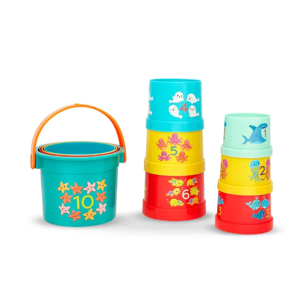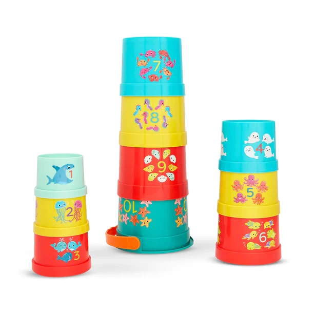 Stacking Cups: Play and learn with 9 colorful stacking cups and 1 handy bucket that stores them all! Numbers 1 to 10: Stack them up, knock ’em down, and learn your 123s along the way – all of the nesting cups are numbered! Beach & Bath: Take these ocean-inspired cups to the beach, play in the sandbox, or make a splash in the bath! Educational Toys: These toys encourage early learning by teaching colors, numbers, hand-eye coordination, and more. Age: These stack up cups are recommended for toddlers 18 months +