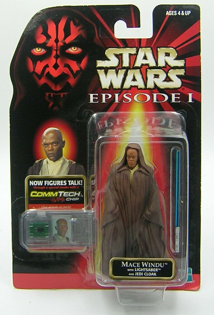 Mace Windu wields a great deal of authority through out the Galactic Republic. He is well aware of the dangers of the Sith. MACE WINDU WITH JEDI CLOAK & LIGHTSABER Star Wars Episode 1 Action Figure & COMMTECH CHIP. Figure stands approximately 3¾ inches tall. Ages 4 and up. From Hasbro.