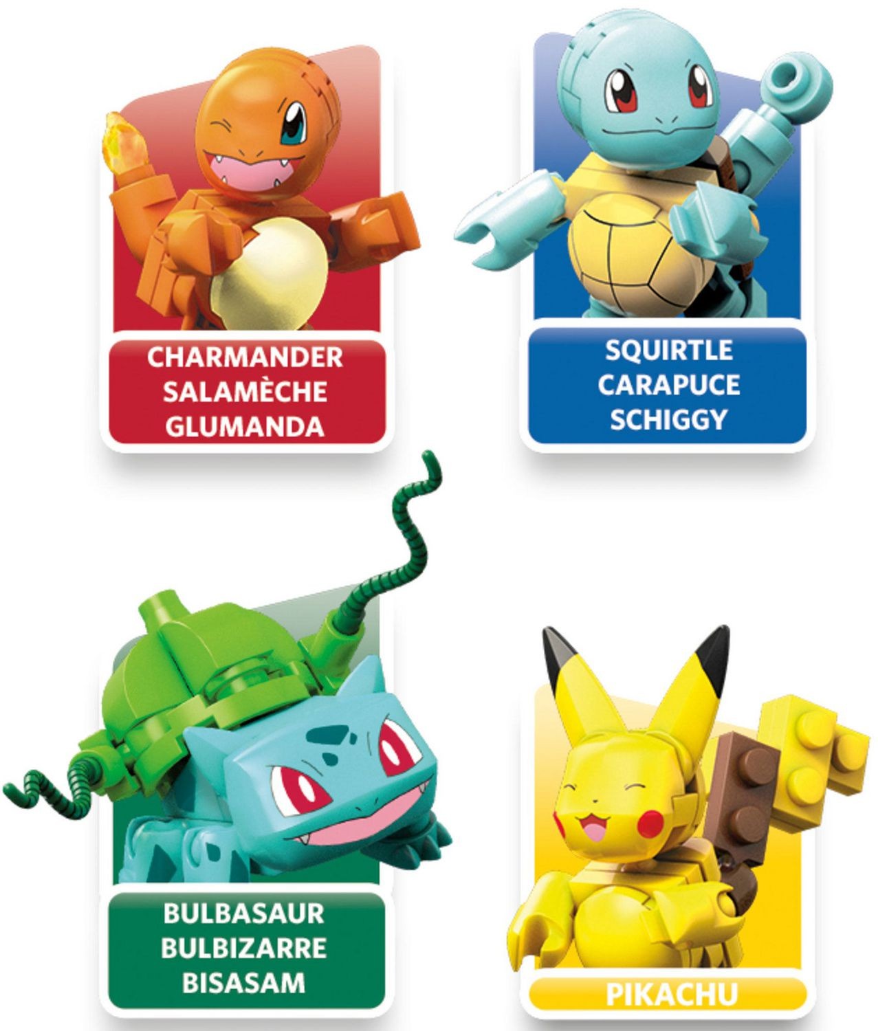 Build the power that's inside with 4 buildable Pokémon, featuring the Kanto first partner Pokémon! This set features famous first partner Pokémon and Pikachu like you've never seen them before; with all-new facial expressions! The 4-pack also includes a buildable Poké Ball for display. Now you don't have to choose between Bulbasaur, Charmander, Squirtle and Pikachu because they're all here together! Build you best team. Battle your worst foes. Become a Pokémon Trainer! Ideal for ages 6 and up. 4 buildable Pokémon figures. Includes Bulbasaur, Charmander, Squirtle and Pikachu with exclusive facial expressions. Poké Ball with pronged top for figure display. Combine with other Pokémon construction sets from Mega Construx. Build your Pokémon world, and Build Beyond!