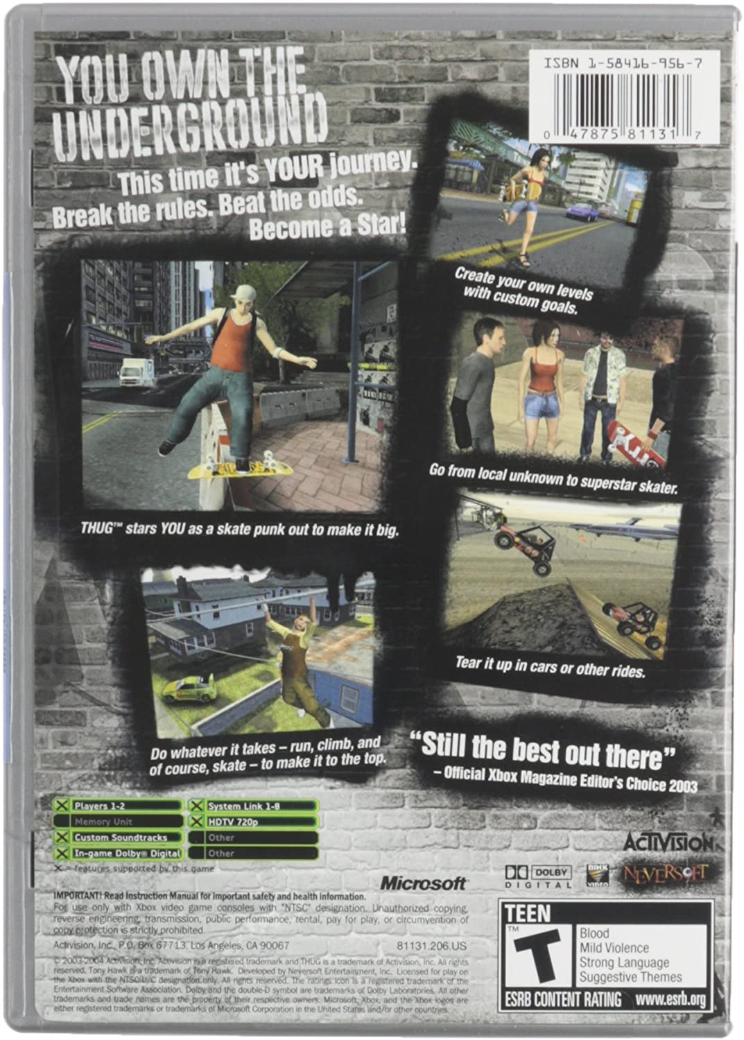 Tony Hawk's Underground breaks all the rules, delivering innovative new features, and, this time, it's all about you. Complete challenges and unveil the plot-twisting, true-to-life story that takes you from unknown local skate punk to fame and fortune as the most popular skater in the world. Along the way, get off your board and explore expansive new levels on foot or in vehicles. In this game, there are no rule ? It's all about the Underground!